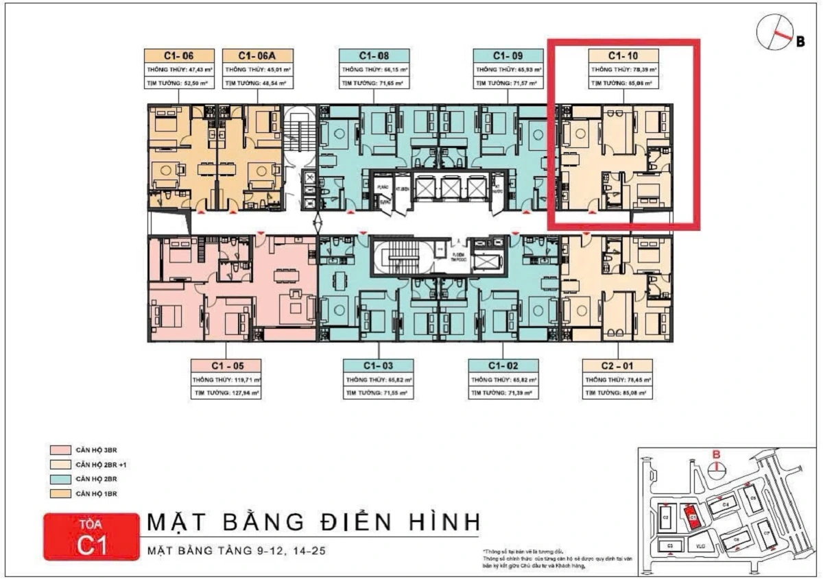 Theo mặt bằng điển hình của tòa C1, mã căn này nằm ở vị trí góc. Cách bố trí này tạo ra lợi thế rõ về độ thoáng và góc mở tầm nhìn. Trong dòng căn 2PN, những mã căn như vậy thường được đánh giá cao hơn. Lý do là chúng cân bằng tốt giữa công năng sử dụng và giá trị tài sản.